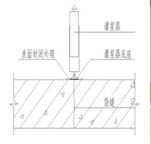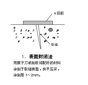 ①表面封閉法:利用混凝土表層微細獨立裂縫(裂縫寬度w≤0.2mm)或網(wǎng)狀裂紋的毛細作用吸收低黏度且具有良好滲透性的修補膠液,封閉裂縫通道。
