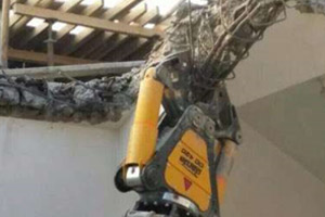 液壓鉗粉碎混凝土,包括 a 粉碎混凝土 b 剪斷鋼筋 c 邊界面整理。 a. 粉碎混凝土 自由面洞口 液壓鉗粉碎混凝土樓板、剪力墻等平面構(gòu)件時,為液壓鉗鉗口提供咬切面和放置設(shè)備的必要空間,應(yīng)采用排列鉆孔切割工藝的方法,形成一個自有面,由此開始進行一下粉碎工程。 自由面洞口尺寸,根據(jù)墻厚不同,可選取500X500mm或400X400mm。剪斷鋼筋 粉碎后混凝土內(nèi)的鋼筋,是處于松弛狀態(tài),可采用氣割、液壓剪、電剪進行切斷。 一般情況下,可分為二次進行。在粉碎過程中隨時進行切斷;最后完成破壞后,沿周邊進行統(tǒng)一劃一的剪切。 邊界面處理 邊界面,是指鉗口粉碎邊線與設(shè)計洞口邊線間的影響區(qū)交界面。一般情況下,在受到鉗口剪壓作用下的混凝土,已經(jīng)發(fā)生疏松或微細(xì)裂縫。通??梢圆捎萌斯ぬ掼彽姆椒ㄟM行整理,以便獲得整齊劃一的洞口邊界。