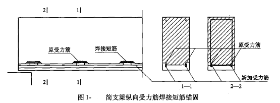 1)對簡支梁的加固縱向受力筋可采用短鋼筋或Z形鋼筋與梁中原縱向受力筋焊接。Z形筋直徑應(yīng)與被連接鋼筋中直徑較小的鋼筋相同。當(dāng)采用雙面焊時,焊縫長度不應(yīng)小于5d。靠近支座的3個錨固點(diǎn)間距不應(yīng)大于5OOmm(見圖1)。